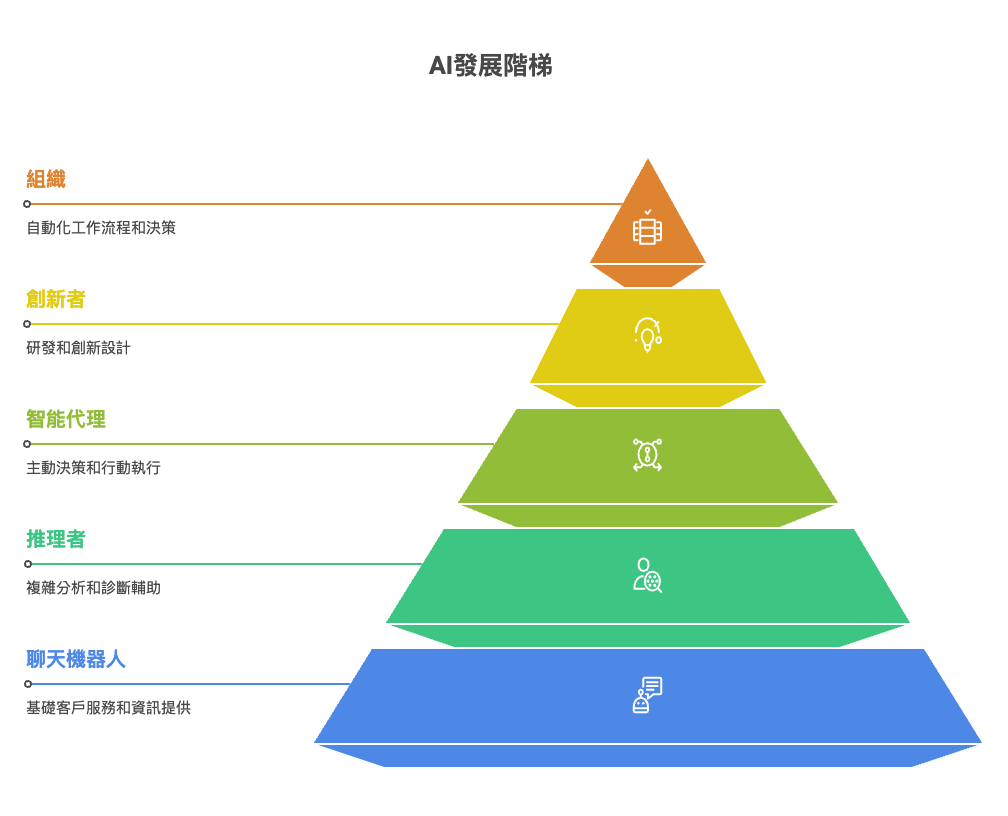 在介紹差異之前,我們先簡單回顧彭博社於 2024 年 7 月的報導:OpenAI 在內部會議中首度公開 AI 發展藍圖,描繪從對話能力一路進化到能執行組織級任務的五個階段。