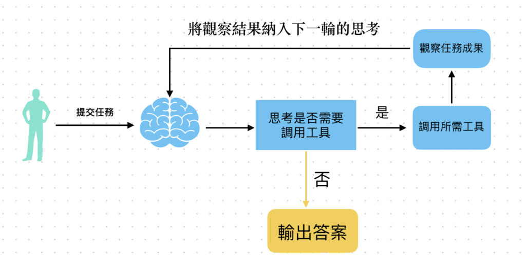 根據觀察結果,Agent 會再次進入思考階段,並判斷是否需要繼續調用其他工具。這樣的思考 ➡️ 行動 ➡️ 觀察 循環會不斷重複,直到 Agent 認為資訊已經足夠,不再需要外部工具支援。